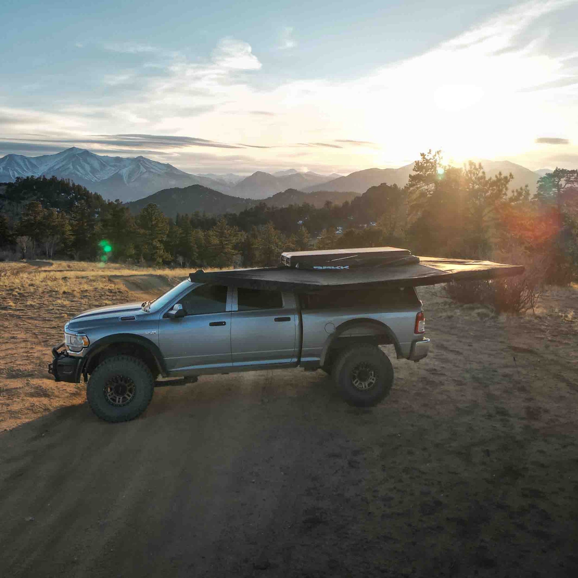 Explore farther and adventure more with the ÖVRCAST 270° Awning. Engineered with 600D Oxford Fabric, this awning withstands harsh conditions, offering 18’ x 12’ of coverage and 6’ of depth. Stay protected from rain and sun with free-standing wind tolerance up to 40 mph, or deploy built-in poles for gusts beyond. Featuring 4 LED lights, it packs into an 82” x 7.5” x 7.5” bag at 61 lbs. Includes awning, stakes, ratcheting guy lines, USB light cord, wrench, L brackets, bolts, and storage bag.